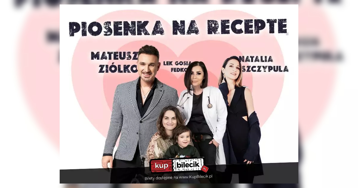 "Piosenka na receptę" to koncert, który jest poświęcony wsparciu Małgosi Szewczyk, niezwykłej samotnej matce dwuletniego chłopca, która mimo swojej niepełnosprawności walczy dzielnie każdego dnia. Na scenie tego wieczoru zobaczymy nie tylko utalentowanych artystów, lecz także wyjątkowych lekarzy, którzy postanowili wesprzeć tę szlachetną inicjatywę. Naszą główną gwiazdą wieczoru będzie Mateusz Ziółko, utalentowany wokalista, którego muzyka dotyka serc wielu ludzi. Towarzyszyć mu będzie utalentowana Natalia Szczypuła, czarująca publiczność swoim głosem i wykonaniem.